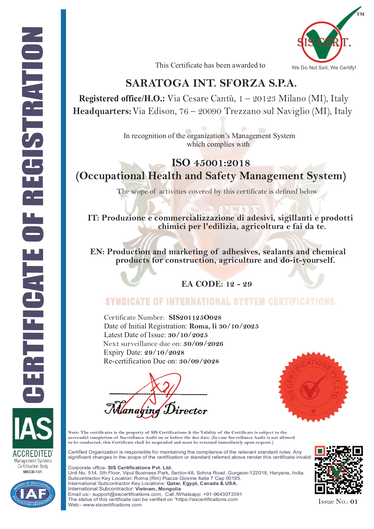 Στη Saratoga εφαρμόζουμε το πρότυπο ISO 45001:2018, το διεθνές πρότυπο για τη διαχείριση της υγείας και της ασφάλειας στην εργασία. Αυτό το πρότυπο μας καθοδηγεί στην πρόληψη ατυχημάτων και επαγγελματικών κινδύνων, δημιουργώντας ένα ασφαλέστερο και πιο προστατευμένο εργασιακό περιβάλλον για όλους.