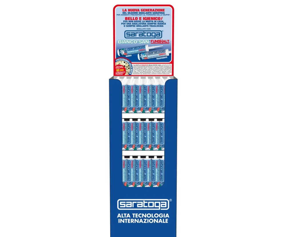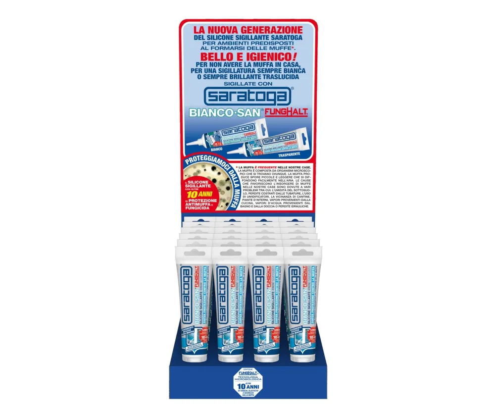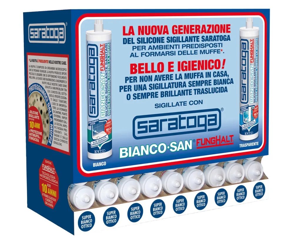 Bianco San®, on the other hand, thanks to FungHalt™, Saratoga's sealant microbicide, guarantees superior protection against mold for over 10 years. It also maintains its high level of white or transparent color, elasticity, and resistance to hot water, abrasion, and light over time.
