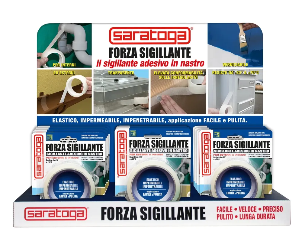 Sigillante adesivo in nastro ad alto spessore che sigilla istantaneamente, con presa sicura e permanente crepe, fessure, tagli, rotture e giunzioni, anche se presenti su superfici irregolari; evitando così i costosi danni provocati da infiltrazioni e perdite.