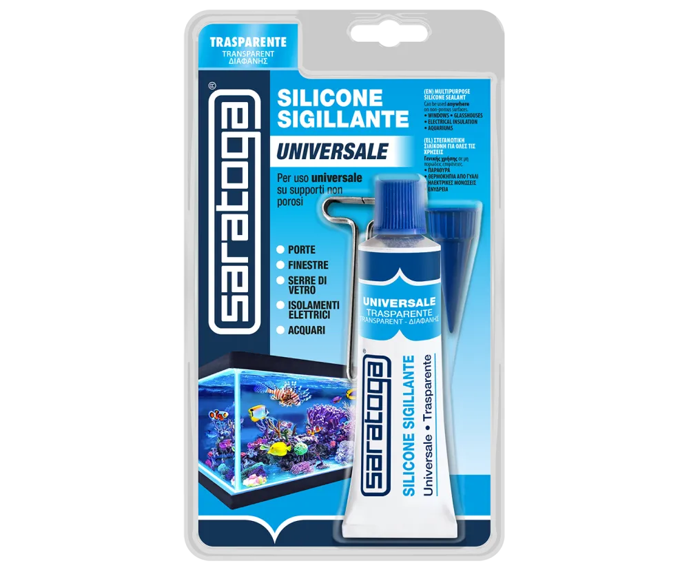 Saratoga Silicone Sigillante Trasparente Universale in blister è un sigillante siliconico, monocomponente a reticolazione acetica, per uso universale ideale per incollaggi e sigillature su supporti non porosi quali ceramica, vetro, alluminio, acciaio, alcune materie plastiche, legno e supporti verniciati.